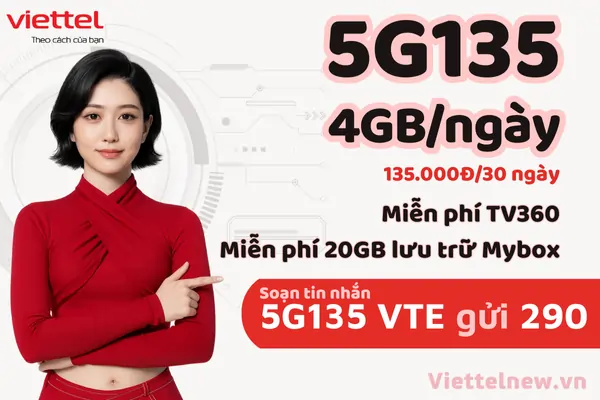 5G135 là gói data dung lượng khá lớn của Viettel, giá 135.000đ/30 ngày, cấp 4 GB/ngày (tổng 120 GB/tháng) ở tốc độ cao 4G/5G. Hết lưu lượng trong ngày, kết nối tạm dừng để không phát sinh cước và tự cộng lại vào 00:00 hôm sau. Gói còn miễn phí data TV360 4K và tặng 20GB Mybox để xem nội dung trên MyTV/Mybox. - Cách đăng ký gói 5G135 như thế nào?