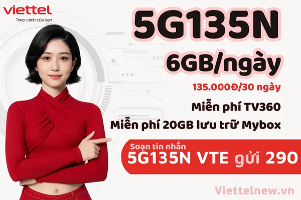 5G135N là gói data dung lượng lớn của Viettel, giá 135.000đ/30 ngày, cấp 6 GB/ngày (tổng 180 GB/tháng) ở tốc độ cao 4G/5G. Hết lưu lượng trong ngày, kết nối tạm dừng để không phát sinh cước ngoài gói và tự cộng lại 6 GB vào 00:00 hôm sau. Gói còn miễn phí data TV360 Basic (màn hình nhỏ) và tặng thêm 20 GB Mybox (tùy thời điểm áp dụng). - Cách đăng ký gói 5G135N như thế nào?