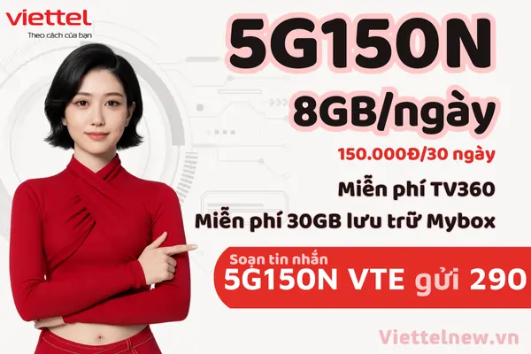 5G150N là gói data theo tháng của Viettel, giá 150.000đ/30 ngày, mỗi ngày có 8GB (tổng 240GB/tháng) sử dụng trên mạng 4G/5G. Gói kèm miễn phí data TV360 gói Basic. Hết lưu lượng trong ngày, kết nối sẽ tạm ngừng và 00:00 ngày hôm sau hệ thống tự cộng lại 8GB mới. - Ai nên đăng ký gói 5G150N?
