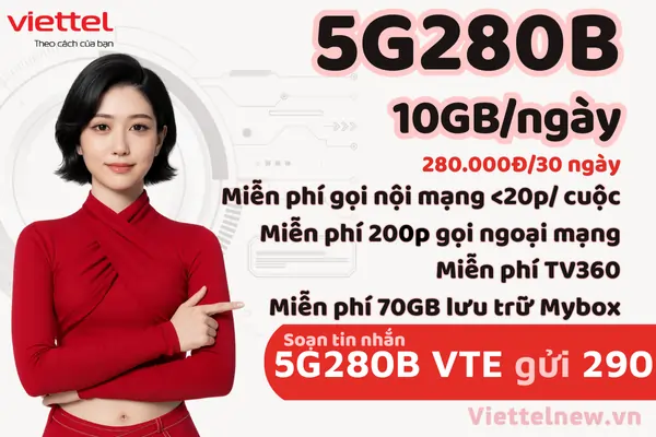 5G280B là gói combo data + thoại của Viettel, giá 280.000đ/30 ngày, cung cấp 10 GB/ngày (tổng 300 GB/tháng) ở tốc độ cao 4G/5G. Hết lưu lượng trong ngày, kết nối sẽ tạm dừng để tránh phát sinh cước và tự cộng lại vào 00:00 hôm sau. Gói còn miễn phí data TV360. - Ai nên đăng ký gói 5G280B?