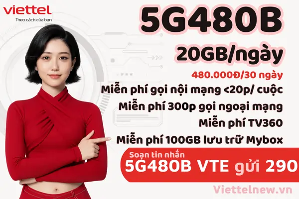 5G480B là gói combo data + thoại cao cấp của Viettel, giá 480.000đ/30 ngày, cung cấp 20 GB/ngày (tổng 600 GB/tháng) ở tốc độ cao 4G/5G. Hết dung lượng trong ngày, kết nối sẽ tạm dừng để tránh phát sinh cước và tự cộng lại 20 GB vào 00:00 hôm sau. Gói còn miễn phí TV360 gói Standard và tặng 200 GB Mybox để lưu trữ dữ liệu, ảnh, video tiện lợi. - Ai nên đăng ký gói 5G480B?