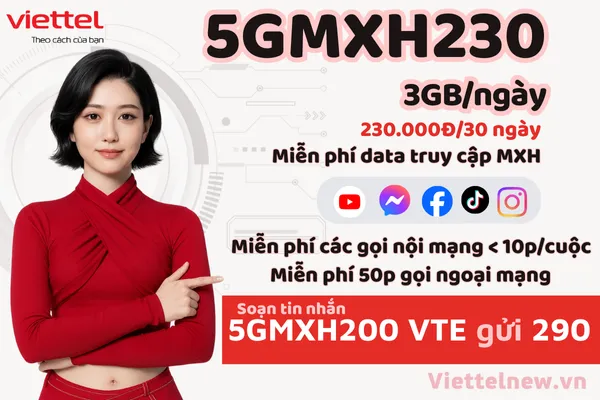5GMXH230 là gói data mạng xã hội theo tháng của Viettel, giá 230.000đ/30 ngày, cung cấp 3GB/ngày (tổng 90GB/tháng) tốc độ cao. Đồng thời, gói miễn phí 100% data khi truy cập các ứng dụng mạng xã hội: YouTube, TikTok, Facebook, Messenger… giúp bạn xem video, lướt mạng, livestream cả ngày không tốn dung lượng chính. Khi hết 3GB/ngày, kết nối sẽ tạm dừng và tự cộng lại lúc 00:00 hôm sau. - Ai nên đăng ký gói 5GMXH230?