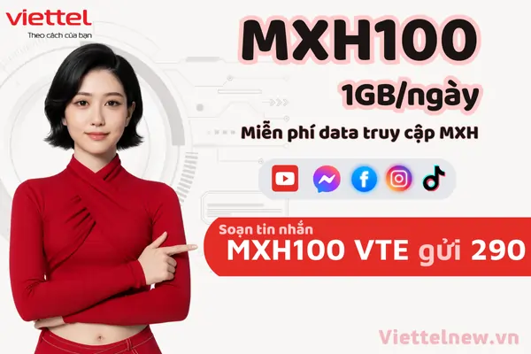 MXH100 là gói cước data của Viettel, giá 100.000đ/30 ngày, cung cấp 1GB/ngày (tổng 30GB/tháng) và miễn phí 100% data tốc độ cao khi truy cập các mạng xã hội phổ biến như: TikTok, YouTube, Facebook, Messenger, Instagram, cùng quyền truy cập không giới hạn ứng dụng TV360 Basic. - Ai nên đăng ký gói MXH100?