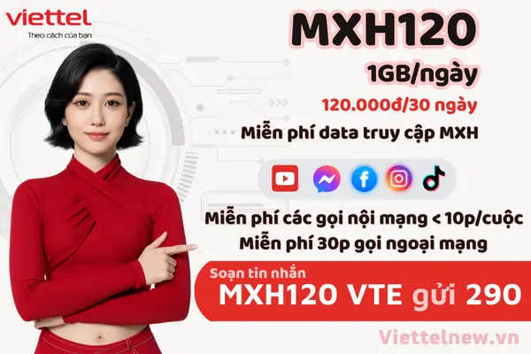 MXH120 là gói cước data của Viettel, giá 120.000đ/30 ngày, cung cấp 1GB/ngày (tổng 30GB/tháng) và miễn phí 100% data tốc độ cao khi truy cập các mạng xã hội phổ biến như: TikTok, YouTube, Facebook, Messenger, Instagram, cùng quyền truy cập không giới hạn ứng dụng TV360 Basic. Miễn phí gọi nội mạng 10 phút/ cuộc, Ngoài ra còn miễn phí 30 phút ngoại mạng - Ai nên đăng ký gói MXH120?