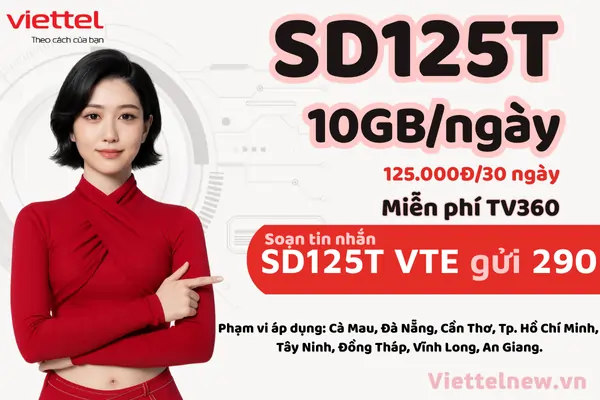 SD125T là gói data theo ngày của Viettel, giá 125.000đ/30 ngày, cung cấp 10 GB/ngày (tổng 300 GB/tháng) ở tốc độ cao 4G. Khi dùng hết 10GB trong ngày, kết nối sẽ tạm dừng để tránh phát sinh cước và tự cộng lại 10GB mới vào 00:00 hôm sau. Gói còn miễn phí data xem TV360 Basic. - Ai nên đăng ký gói SD125T?