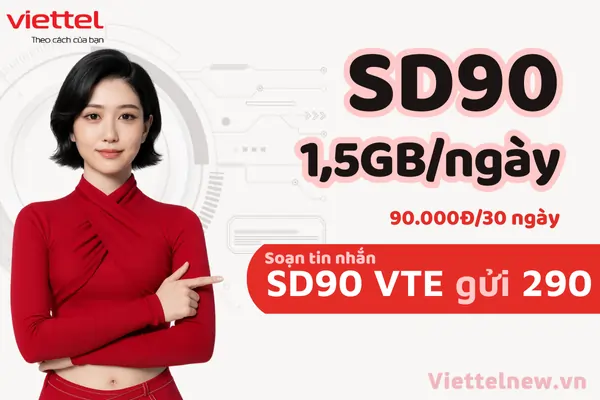 SD90 là gói cước data của Viettel, giá 90.000đ/30 ngày, cung cấp 1,5 GB/ngày (tổng 45 GB/tháng) ở tốc độ cao. Khi hết dung lượng trong ngày, dịch vụ sẽ tạm dừng và tự cộng lại vào 00:00 hôm sau, giúp bạn kiểm soát chi phí và duy trì kết nối ổn định suốt chu kỳ. - Ai nên đăng ký gói SD90?
